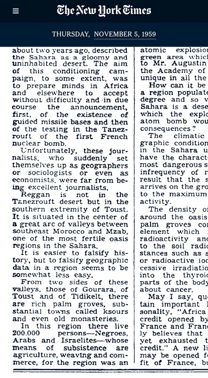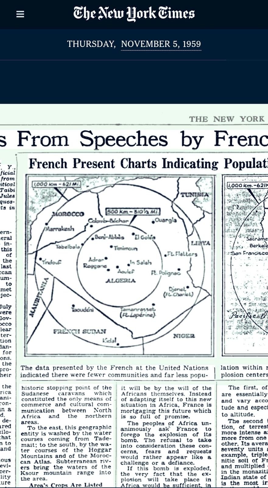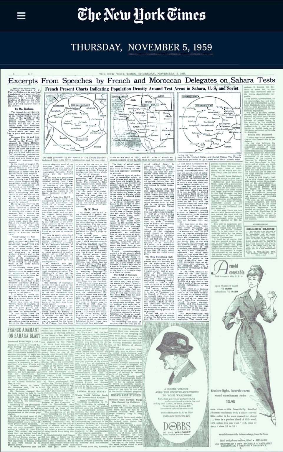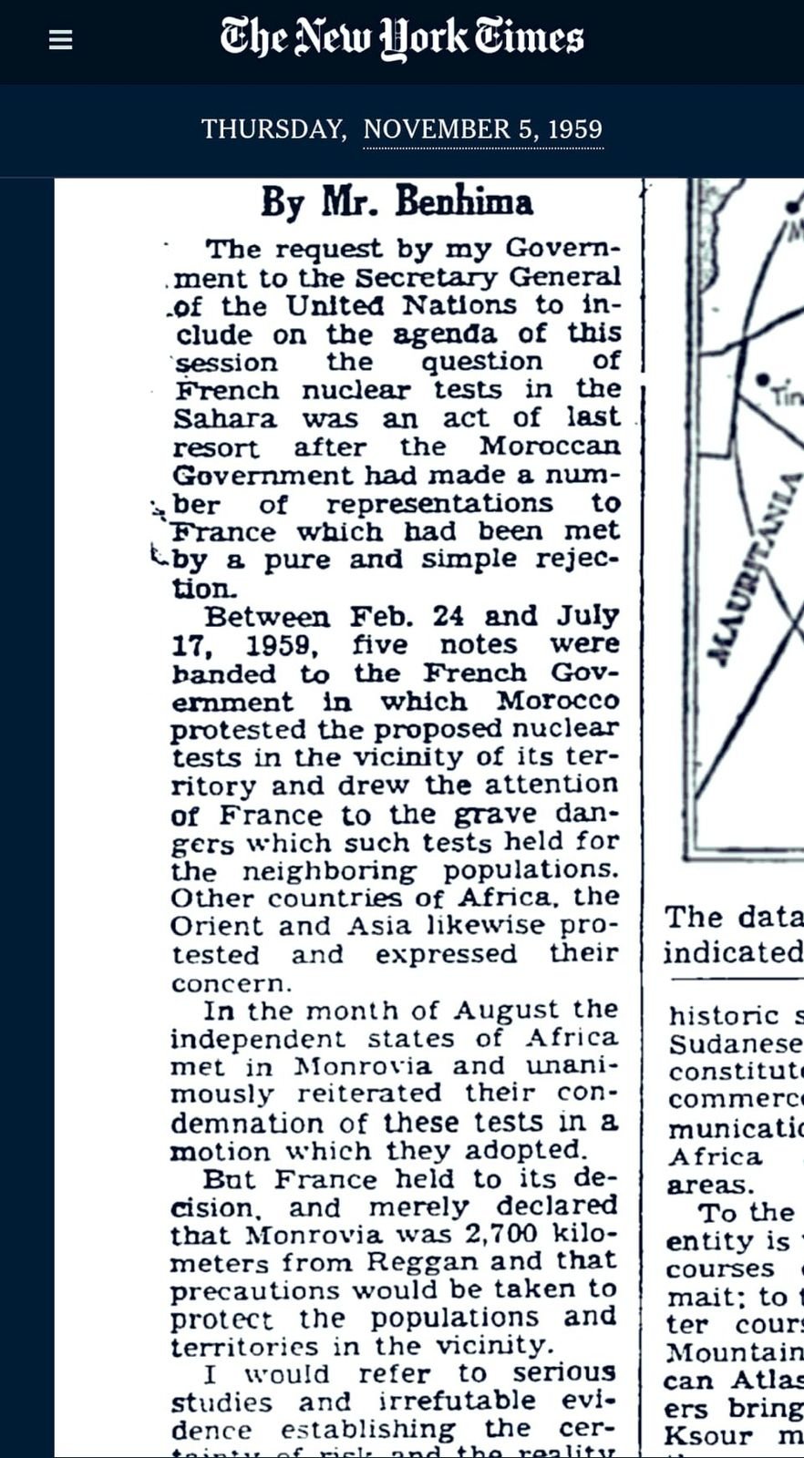 يتحدث مقال الصحيفة الأمريكية عن سجال كبير بين وفد المملكة المغربية بالامم المتحدة الذي كان يترأسه السفير أحمد الطيبي بن هيمة والوفد الفرنسي الذي كان يمثله السفير Jules Moch هذا الأخير الذي ابلغ الامم المتحدة بنية فرنسا اجراء اولى تجاربها النووية بالصحراء مبررا ان اختيار تلك المنطقة كونها غير مأهولة بالسكان وقاحلة